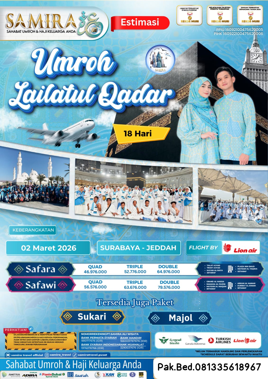 Paket umroh lailatul qadar 18 hari adalah paket yang cocok untuk semua kalangan, dengan durasi yang tidak terlalu pendek dan juga tidak terlalu lama. Paket ini sudah include umroh 2x dengan semua rangkaian ibadah yang terjaga di makkah dan madinah.